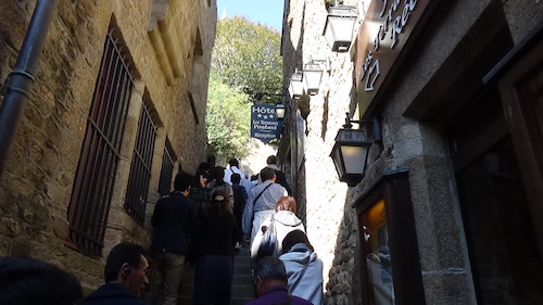 島内の狭い通路をガイドさんに着いて歩きます。この道もモンサンミッシェルの魅力の一つ。お店と修道院と教会が複雑に折り重なっているようです。